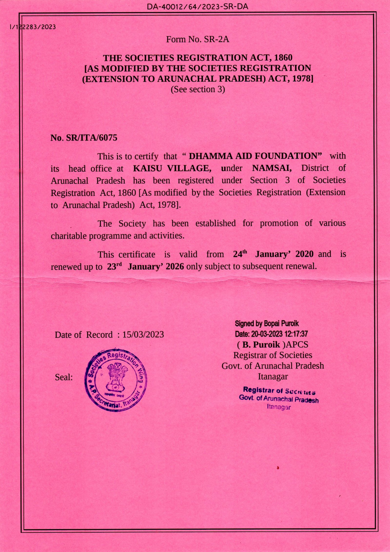 The Dhamma Aid Foundation, Namsai, Arunachal Pradesh, is a registered organization under Societies Registration Act. 1860, and one of the active Buddhist charitable organization of India was established by the blessings of Late Most Venerable Indavansa Mahathera (former Sangha Nayaka of Arunachal Pradesh Bhikkhu Sangha), founder president of Dhamma Aid Foundation, Kaisu. in 2018. Since then it has ventured many humanitarian service activities based on the need of the local people.